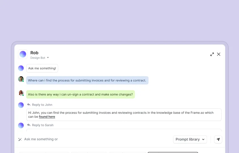 Create as many AI employees you want for your business. They behave in function of your employees role, your industry and the data in your Frame workspace.