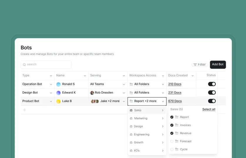Feed our AI employees with content sitting on our 10 productivity apps. From Whiteboard to Wiki, the more data, the better the insights.