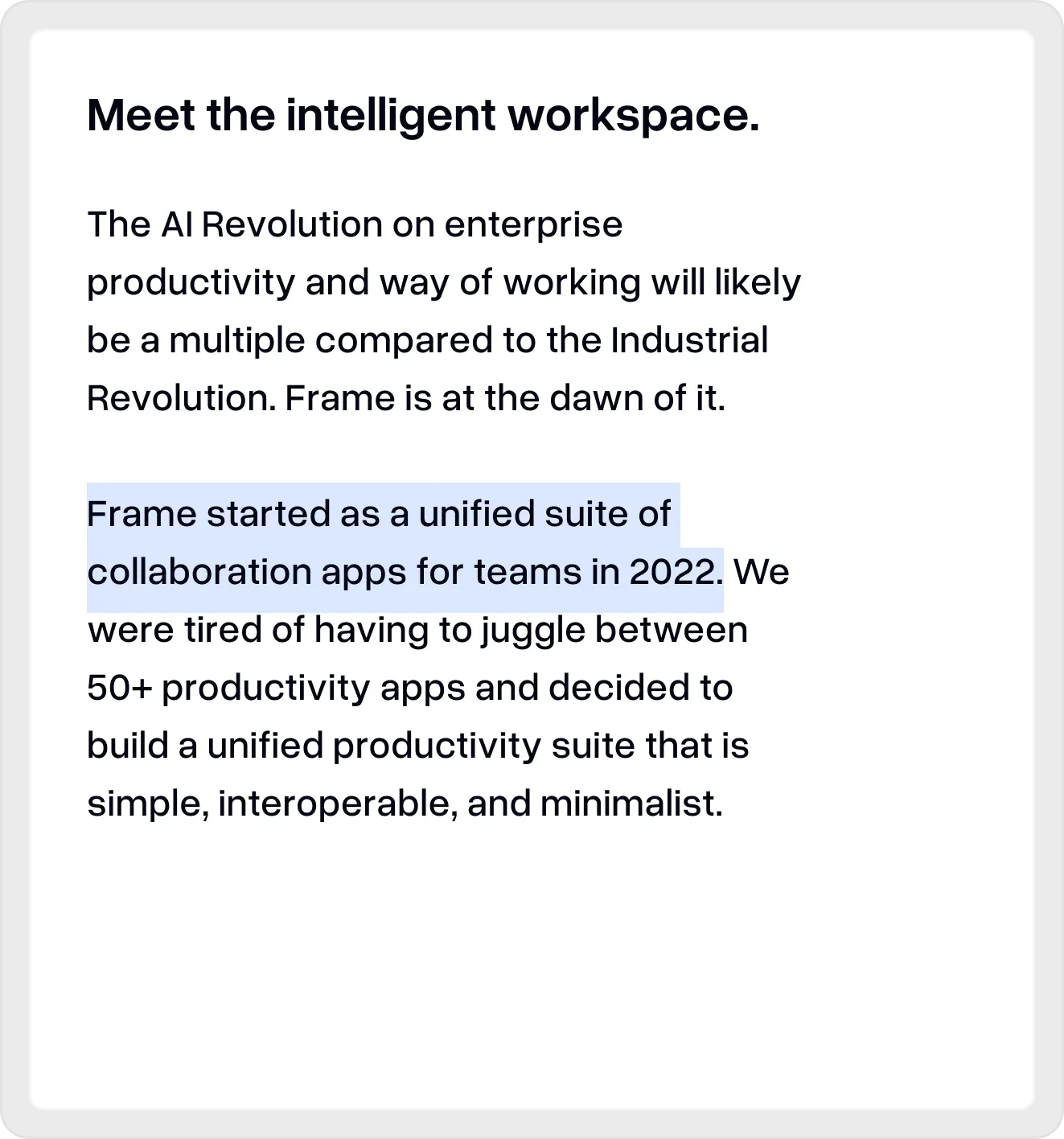 Facilitates collaboration by allowing users to link and share content across Frame's native apps and external documents, enhancing team synergy.